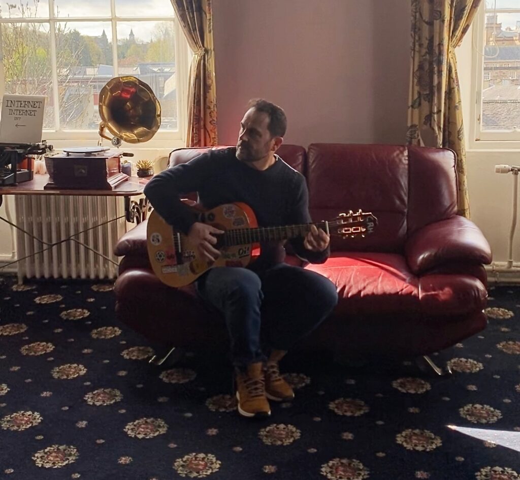 “Yo empecé tocando la guitarra sin conocimiento. Un grupo de chavales de 17 años que quieren hacer un poco de rock. Tocaba la guitarra, pero pues eso, sin saber absolutamente nada, cuatro acordes y cuatro cosas. Entonces, luego pensé, vale, esto me gusta mucho, voy a intentar aprender. Para entonces, no había muchas escuelas de guitarra eléctrica, entonces me fui a una escuela donde había un profesor de guitarra y solo había guitarra clásica. Y nada, comencé a descubrir cómo funcionaba la guitarra al 100%, a conocer la música, el lenguaje musical, las composiciones de diferentes épocas, todo siempre desde la música clásica, Y pues al final me dediqué de pleno a la música clásica. Fue una época en la que me dediqué solo a esto. Pero luego llegó otro momento de mi vida, a los 30 años o así, que me saturé un poco de este tipo de música y volví otra vez a la música pop, rock o soul, pero quise hacer mi propia música, ya había hecho canciones instrumentales, o sea, hago por ejemplo la música de grupos rock y tal, pero nunca había escrito letras, nunca. Y fue un momento en el que me veía preparado para poder escribir historias y tal, me quería poner a prueba con letras, una de ellas fue Anna Frank, con la banda Saraband.
